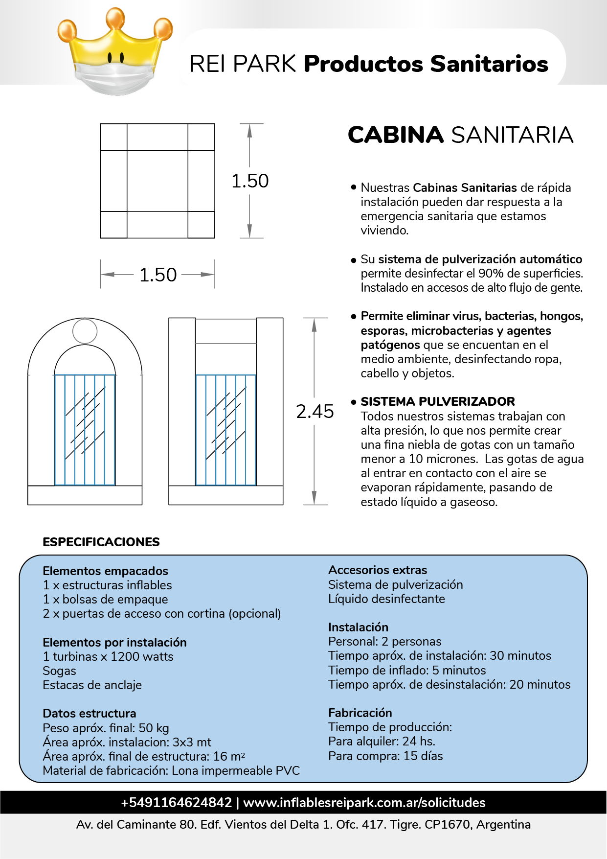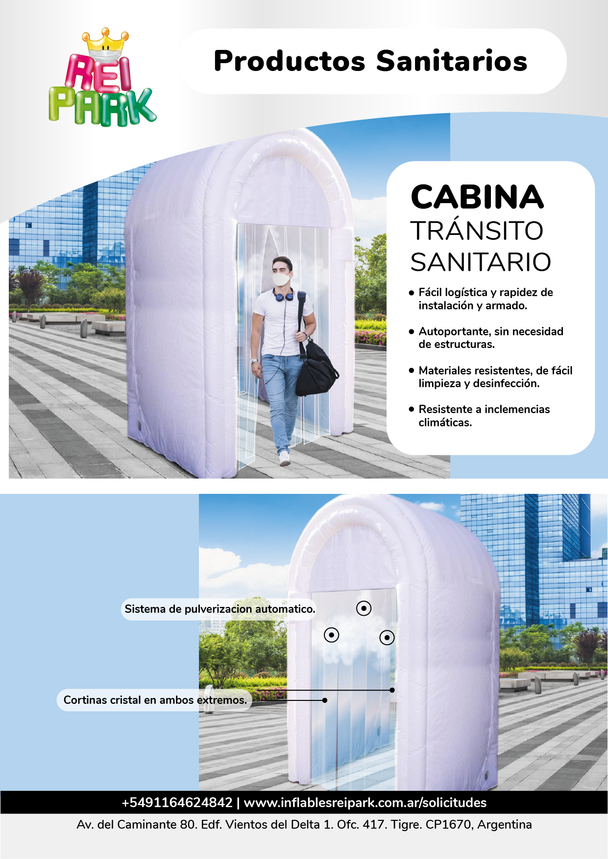 PDF PRODUCTOS SANITARIOSDescripción:Nuestras Cabinas Sanitarias de rápida instalación pueden dar respuesta a la emergencia sanitaria que estamos viviendo. Su sistema de pulverización automático permite desinfectar el 90% de superficies. Instalado en accesos de alto flujo de gente. Permite eliminar virus, bacterias, hongos, esporas, microbacterias y agentes patógenos que se encuentran en el medio ambiente, desinfectando ropa, cabello y objetos.